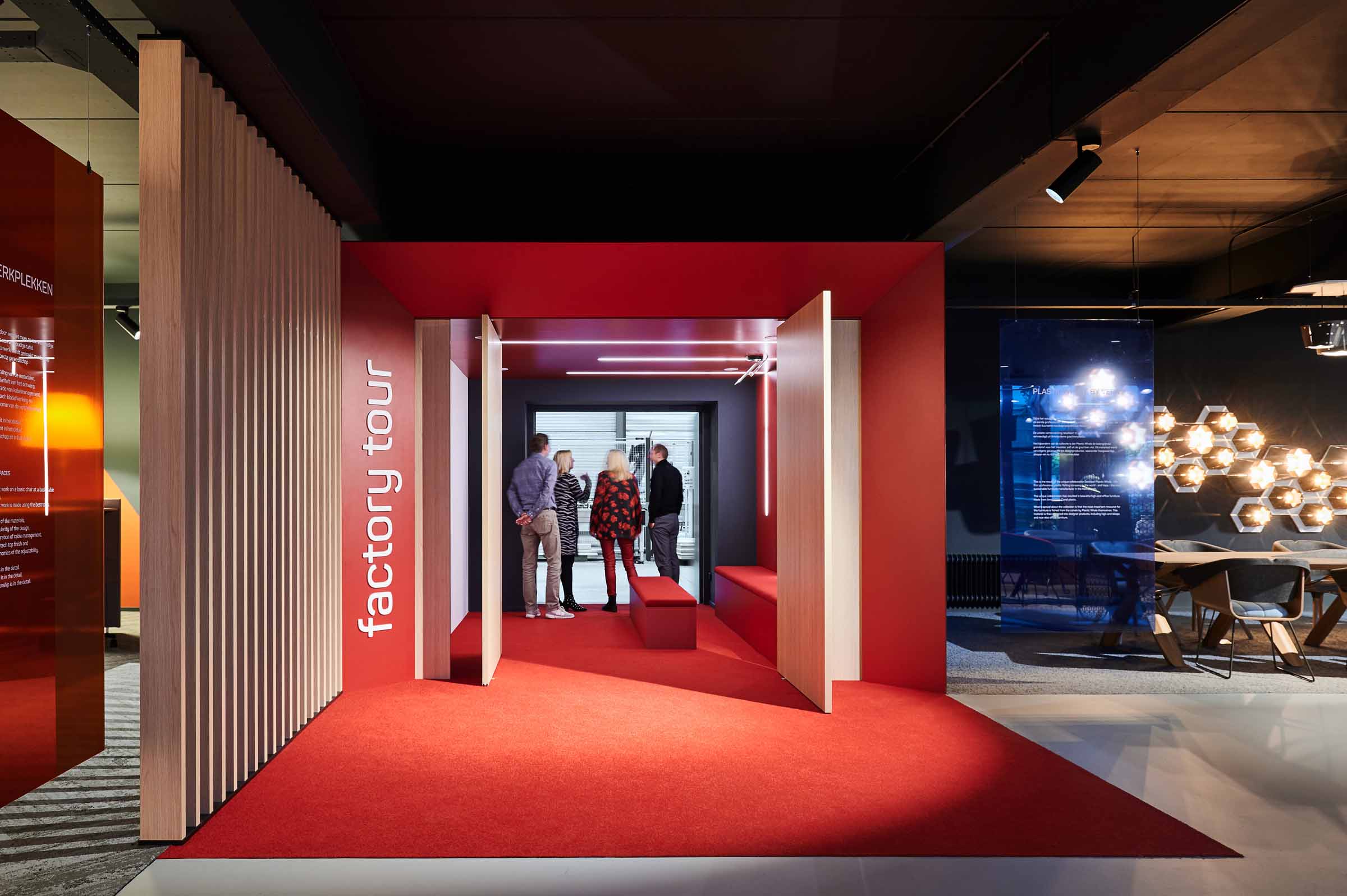 | Omschrijving | Voor de vernieuwde showroom van Vepa the furniture factory verzorgden wij het speciaalwerk. Het interieur vormt een belangrijk communicatiemiddel waarin beleving en functionaliteit samenkomen. In de showroom worden bezoekers meegenomen in alles wat Vepa te bieden heeft, van hoogwaardige meubelstukken tot complete werkomgevingen. Duurzaamheid en innovatie vormen daarbij de rode draad. Via de sluis stappen bezoekers letterlijk de fabriek binnen, waar de showroom naadloos overgaat in een unieke factory tour. |